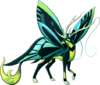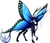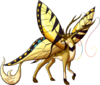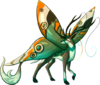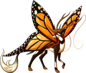 Tyilings are beautiful, rare creatures that lay dormant most of the year and only seem to emerge with the blooming of flowers in the spring, when they then become plentiful. They are incredibly lightweight, able to fly unladen for moderate distances via their large, butterfly-like wings. Close relatives to Qidrik, these deer are fairly calm and docile even when wild, showing little to no fear of predators while they peacefully eat fresh grasses and flower buds. Though their antlers are long, sturdy, and sharp, a Tyiling does not use them for defense-- rather, the antlers connect to the creature's long, drooping antennae, raising them so that the wind will blow them and spread the dust that falls from the long feelers.